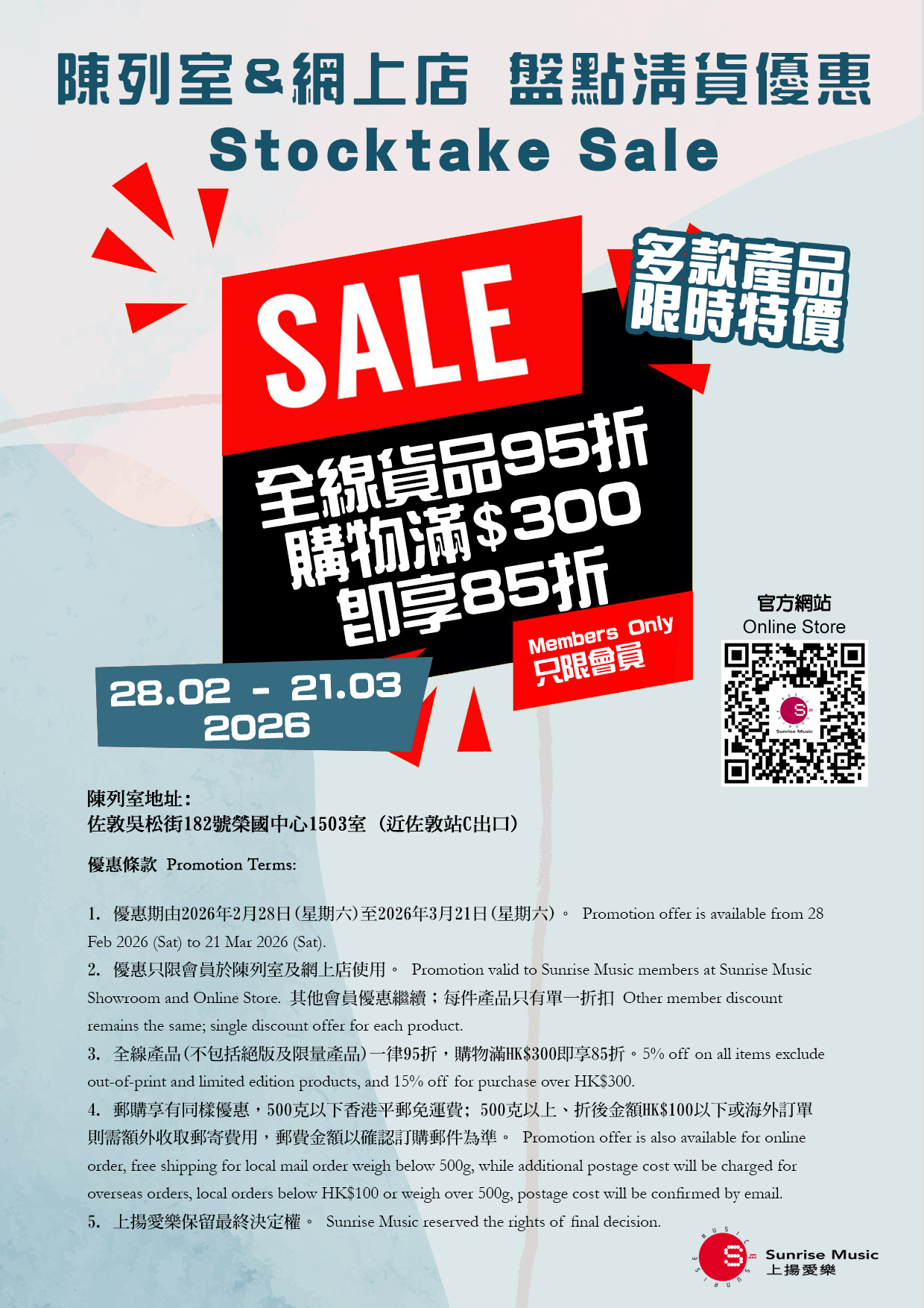1. 優惠期由2026年2月28日(星期六)至2026年3月21日(星期六)。 Promotion offer is available from 28 Feb 2026 (Sat) to 21 Mar 2026 (Sat). 2. 優惠只限會員於陳列室及網上店使用。 Promotion valid to Sunrise Music members at Sunrise Music Showroom and Online Store. 其他會員優惠繼續;每件產品只有單一折扣 Other member discount remains the same; single discount offer for each product. 3. 全線產品(不包括絕版及限量產品)一律95折,購物滿HK$300即享85折。5% off on all items exclude out-of-print and limited edition products, and 15% off for purchase over HK$300. 4. 郵購享有同樣優惠,500克以下香港平郵免運費; 500克以上、折後金額HK$100以下或海外訂單則需額外收取郵寄費用,郵費金額以確認訂購郵件為準。 Promotion offer is also available for online order, free shipping for local mail order weigh below 500g, while additional postage cost will be charged for overseas orders, local orders below HK$100 or weigh over 500g, postage cost will be confirmed by email. 5. 上揚愛樂保留最終決定權。 Sunrise Music reserved the rights of final decision.