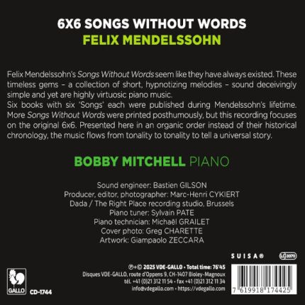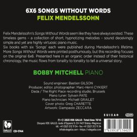 Songs without Words, Op. 19b: No. 1 in E Major, MWV U86 – Op. 53: No. 6 in A Major, MWV U154 – Op. 19b: No. 4 in A Major, MWV U73 – Op. 19b: No. 5 in F-Sharp Minor, MWV U90 – Op. 67: No. 2 in F-Sharp Minor, MWV U145 – Op. 30: No. 6 in F-Sharp Minor, MWV U110 – Op. 30: No. 1 in E-Flat Major, MWV U103 – Op. 53: No. 2 in E-Flat Major, MWV U109 – Op. 30: No. 2 in B-Flat Minor, MWV U77 – Op. 67: No. 3 in B-Flat Major, MWV U102 – 62: No. 2 in B-Flat, MWV U181 – Op. 19b: No. 6 in G Minor, MWV U78 – Op. 38: No. 1 in E-Flat Major, MWV U121 – Op. 38: No. 2 in C Minor, MWV U115 – Op. 67: No. 4 in C Major, MWV U182 – Op. 53: No. 4 in F Major, MWV U114 – Op. 38: No. 5 in A Minor, MWV U137 – Op. 53: No. 5 in A Minor, MWV U153 – Op. 53: No. 1 in A-Flat Major, MWV U143 – Op. 38: No. 6 in A-Flat Major, MWV U119 – Op. 67: No. 1 in E-Flat Major, MWV U180 – Op. 53: No. 3 in G Minor, MWV U144 – Op. 62: No. 4 in G Major, MWV U175 – Op. 30: No. 5 in D Major, MWV U97 – Op. 19b: No. 3 in A Major, MWV U89 – Op. 62: No. 5 in A Minor, MWV U151 – Op. 62: No. 3 in E Minor, MWV U177 – Op. 19b: No. 2 in A Minor, MWV U80 – Op. 38: No. 4 in A Major, MWV U120 – Op. 62: No. 6 in A Major, MWV U161 – Op. 62: No. 1 in G Major, MWV U185 – Op. 30: No. 4 in B Minor, MWV U98 – Op. 67: No. 5 in B Minor, MWV U184 – Op. 38: No. 3 in E Major, MWV 107 – Op. 30: No. 3 in E Major, MWV U104 – Op. 67: No. 6 in E Major, MWV U188