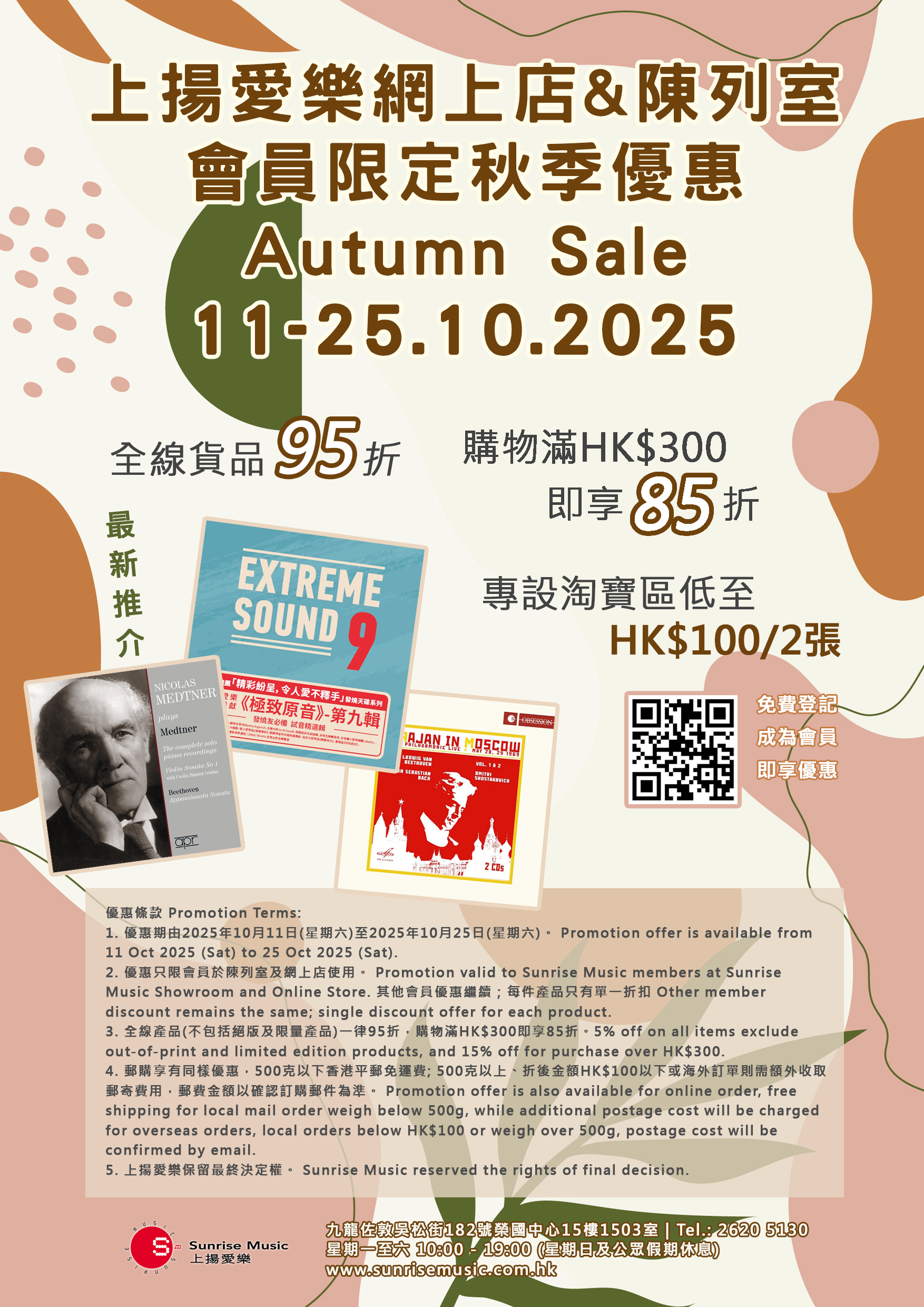 2. 優惠只限會員於陳列室及網上店使用。 Promotion valid to Sunrise Music members at Sunrise Music Showroom and Online Store. 其他會員優惠繼續;每件產品只有單一折扣。Other member discount remains the same; single discount offer for each product.